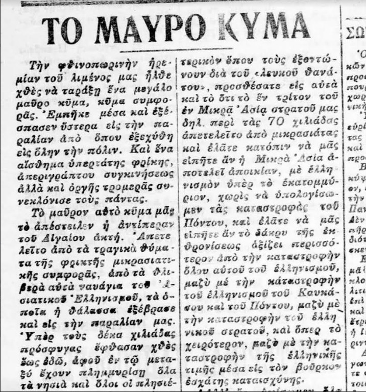 Την φθινοπωρινήν ηρεμίαν του λιμένος μας ήλθε χθες να ταράξη ένα μεγάλο μαύρο κύμα, κύμα συμφοράς. Εμπήκε μέσα και εξέσπασε ύστερα εις την παραλίαν από όπου εξεχύθη εις όλην την πόλιν. Και ένα αίσθημα υπερτάτης φρίκης, απεριγράπτου συγκινήσεως αλλά και οργής τρομεράς συνεκλόνισε τους πάντας […] Το θέαμα των θλιβερών αυτών θυμάτων της φρικτής καταστροφής εσπάρασσεν την ψυχήν του καθενός […] Ας κύψωμεν επάνω του και ας προσπαθήσωμεν να γλυκάνωμεν όσον ημπορούμεν, όσο είναι δυνατόν τον πόνον του.