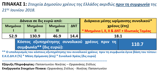 Ξεκινώντας την επίλυση του πρώτου υπό-προβλήματος και σύμφωνα με στοιχεία του Οργανισμού Διαχείρισης Δημοσίου Χρέους (Ο.Δ.ΔΗ.Χ) το ετήσιο κόστος εξυπηρέτησης του δημοσίου χρέους μας σε ταμειακή βάση (Ε.Κ.Ε.ΔΗ.Χ) πριν τη συμφωνία βρισκόταν στα 1.7%, ενώ η διάρκεια μέσης ωρίμανσης του συνολικού χρέους της χώρας ήταν στα 18.1 έτη. Το συνολικό χρέος της Ελλάδος πριν τη συμφωνία ήταν 344.7 δισεκατομμύρια ευρώ. Οπότε το κόστος εξυπηρέτησης του συνολικού χρέους της Ελλάδος πριν τη συμφωνία της 21ης Ιουνίου 2018 διαμορφωνόταν στα 110.7 δισεκατομμύρια ευρώ. (Δείτε συμπληρωματικά και τα στοιχεία του ΠΙΝΑΚΑ 1)