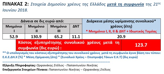 Προχωρώντας στην επίλυση του δεύτερου υπό-προβλήματος υπολόγισα το νέο ετήσιο κόστος εξυπηρέτησης του δημοσίου χρέους σε ταμειακή βάση (Ε.Κ.Ε.ΔΗ.Χ) που πέφτει στο 1.68% από το 1,7% που ήταν πριν τη συμφωνία, ταυτόχρονα κάνω τις υποθέσεις ότι η κυβέρνηση θα εξοφλήσει μέσα στο 2018 ποσό 3.3 δις ευρώ προς το Δ.Ν.Τ. και ότι θα εισπράξει 4.5 δισεκατομμύρια ευρώ σε ισόποσες εξαμηνιαίες δόσεις από την Ε.Κ.Τ εφόσον τηρεί τις δεσμεύσεις της. Να σημειώσω ότι το συνολικό χρέος της Ελλάδος μετά τη συμφωνία και στη λήξη του Μνημονίου ΙΙΙ διαμορφώνεται στα 359.7 δισεκατομμύρια ευρώ. Με επεξεργασία των παραπάνω δεδομένων προκύπτει ότι το κόστος εξυπηρέτησης του συνολικού χρέους της Ελλάδος μετά τη συμφωνία της 21ης Ιουνίου διαμορφώνεται στα 123.7 δισεκατομμύρια ευρώ. (Δείτε συμπληρωματικά και τα στοιχεία του ΠΙΝΑΚΑ 2)