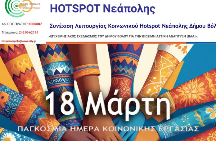 Η Παγκόσμια Ημέρα Κοινωνικής Εργασίας, που τιμάται φέτος στις 18 Μαρτίου, αποτελεί μια υπενθύμιση του πολύτιμου ρόλου που διαδραματίζει η κοινωνική εργασία στην υποστήριξη των ευάλωτων ομάδων και στη βελτίωση της κοινωνικής συνοχής. Το Hotspot Νεάπολης αποτελεί μία σημαντική δομή που προσφέρει πολύτιμο έργο στον τομέα της Κοινωνικής Αλληλεγγύης στον Βόλο, ιδιαίτερα στις συνοικίες της Νεάπολης και των Αγίων Αναργύρων, οι οποίες αντιμετωπίζουν αυξημένες κοινωνικές και οικονομικές προκλήσεις.