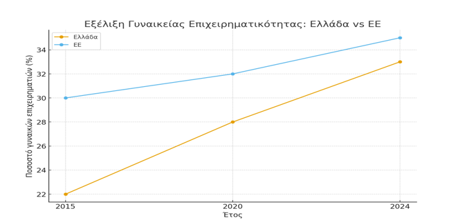 Τα διαθέσιμα ευρωπαϊκά δεδομένα παρουσιάζουν μια σταθερή ανοδική πορεία: το 2015 το ποσοστό των γυναικών επιχειρηματιών στην Ελλάδα βρισκόταν στο 22%, το 2020 ανέβηκε στο 28%, ενώ το 2024 άγγιξε το 33% και πλησιάζει σταδιακά τον μέσο όρο της Ευρωπαϊκής Ένωσης, ο οποίος ανέρχεται στο 35%. Παρά τις δυσκολίες, η αύξηση αυτή αντανακλά την ενδυνάμωση των γυναικών και την αλλαγή της κοινωνικής νοοτροπίας γύρω από την επιχειρηματικότητα.