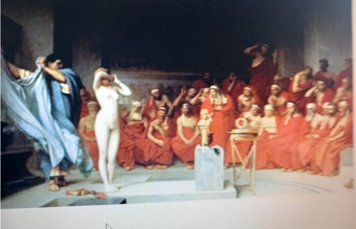 Κατά τη διεξαγωγή της δίκης, ο Υπερείδης, βλέποντας ότι ήταν δύσκολο να μεταπείσει όλους τους δικαστές και φοβούμενος μήπως χάσει τη δίκη, μηχανεύτηκε το εξής: έπιασε τη Φρύνη από το χέρι, την έφερε μπροστά για να τη βλέπουν όλοι οι δικαστές, τράβηξε τον γαλάζιο μανδύα της, φάνηκε η εταίρα ολόγυμνη, και ρώτησε: “ποιος από σας τους δικαστές θα καταδικάσει τη δύναμη και το κάλλος της Θεάς;¨”.
