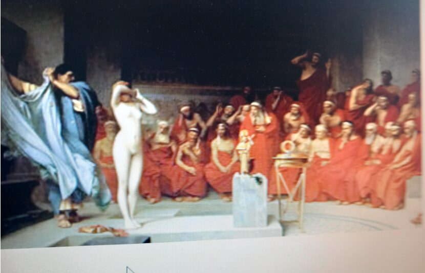 Οι Ηλιαστές δικαστές θαμπωμένοι από τα θεία κάλλη της Φρύνης και νομίζοντας ότι έβλεπαν μπροστά τους την ίδια τη θεά Αφροδίτη, την αθώωσαν πανηγυρικά. Από τότε θεσπίστηκε νόμος πως δεν θα έβγαζαν καταδικαστική απόφαση για κανέναν, εάν πρώτα δεν τον έβλεπαν μπροστά τους.