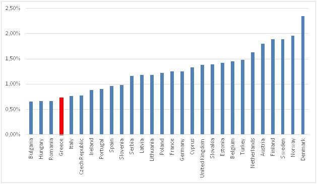Σχήμα 2. Δημόσια δαπάνη για την 3βάθμια εκπαίδευση ως % του ΑΕΠ (2015)