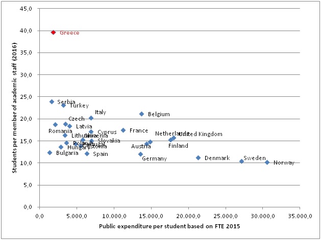 Απαιτείται λοιπόν σημαντική και συστηματική επένδυση στον τομέα. Συμβαίνει όμως αυτό; Από τα δεδομένα φαίνεται ότι έχουμε πολύ χαμηλά επίπεδα δημόσιας δαπάνης ως ποσοστό τους ΑΕΠ, δαπάνης ανά φοιτητή και το χειρότερο δείκτη στην αναλογία φοιτητών προς ακαδημαϊκό προσωπικό.