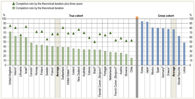 Διεθνώς καταγράφεται μεγάλη απόκλιση μεταξύ της θεωρητικής και της πραγματικής διάρκειας των σπουδών. Σύμφωνα με την πιο πρόσφατη έκθεση του ΟΟΣΑ ο μέσος χρόνος αποφοίτησης στο θεωρητικό χρόνο σπουδών είναι μόνο 39% των φοιτητών ενώ το ποσοστό αυτό αυξάνεται στο 67% μετά από 3 έτη. Στις ΗΠΑ το ποσοστό αποφοίτησης στο θεωρητικά προβλεπόμενο χρόνο είναι 39,4% ενώ σε χρόνο ν+50% είναι μόλις 60% (50% στα ιδιωτικά κερδοσκοπικά). Ακόμη και μετά μια διόρθωση της τάξης του 20 ή 25 %, λόγω της διαφορετικής μεθοδολογίας που χρησιμοποιείται – ότι η χώρα μας δεν υστερεί σε σχέση με τις χώρες της ΕΕ και του ΟΟΣΑ (Σχήμα 1).