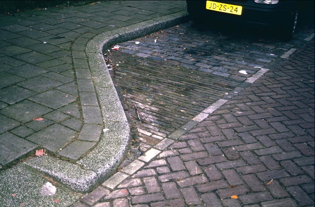 Στην φωτογραφία τοπική διαπλάτυνση πεζοδρομίου, Dordrecht 20.01.1995. Κάτω αριστερά η ράμπα για τα αμαξίδια.