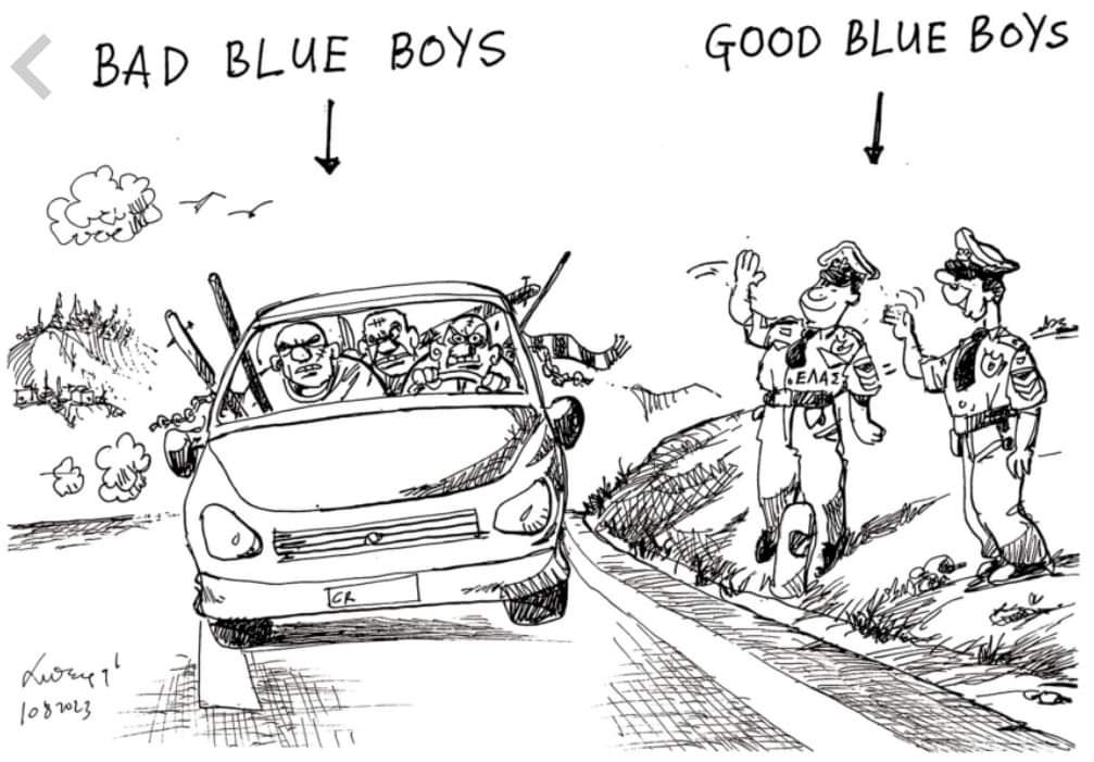 Στην φωτογραφία μια πολύ επιτυχημένη γελοιογραφία αναφορικά με την ανενόχλητη κίνηση των Κροατών «Blue Bad Boys» στους ελληνικούς δρόμους υπό την «χαλαρή επίβλεψη» των Ελλήνων «Good Blue Boys» αστυνομικών.