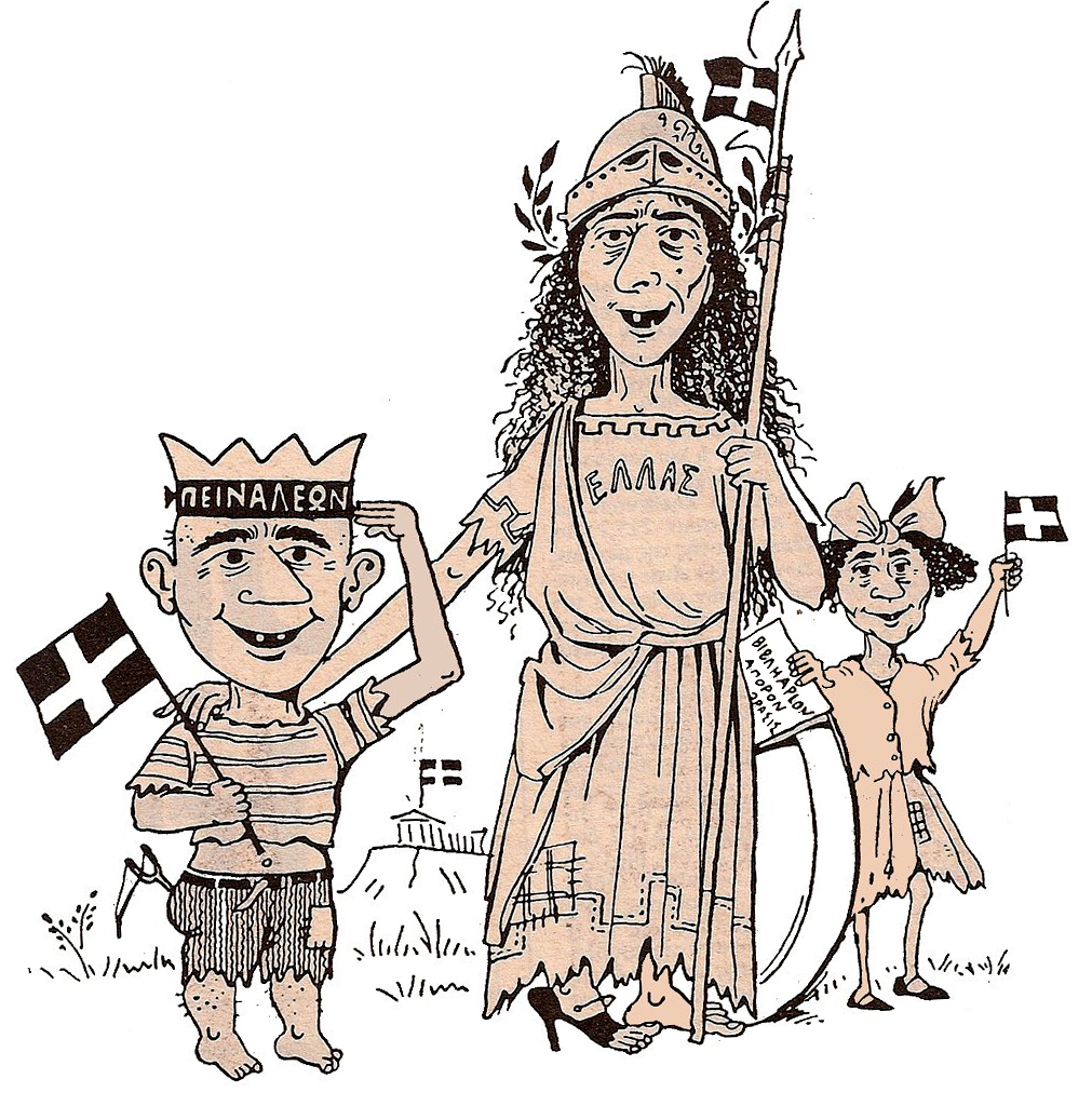 Στο σκίτσο του Μποστ (Μέντης Μποσταντζόγλου, 1918-1995) με την Μαμά Ελλάδα, που φοράει ένα μόνο ψηλοτάκουνο γοβάκι, και τα δυο παιδιά της, τον Πειναλέοντα, που χαιρετάει στρατιωτικά με το αριστερό χέρι και την Ανεργίτσα, που κρατάει στο δεξί χέρι «βιβλιάριον απόρον κορασίς», ο ενθουσιασμός είναι καταφανής και οι (τότε) σημαίες ανεμίζουν.
