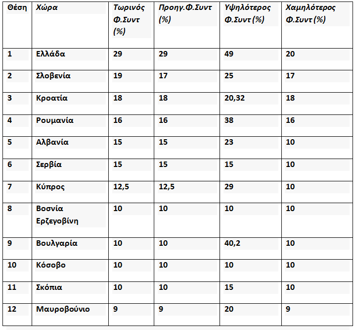 Όπως μπορείτε να διαπιστώσετε, η Ελλαδα βρίσκεται στη κορυφή της λίστας με 29% με την επόμενη Βαλκανική χώρα (Σλοβενία) να βρίσκεται 10% πιο κάτω, στο 19%. Για την ιστορία, η χώρα μας κατέχει τη 3η θέση Πανευρωπαϊκά μαζί με το Βέλγιο με τους υψηλότερους φορολογικούς συντελεστές. Επιπρόσθετα η χώρα μας έχει το θλιβερό προνόμιο να έχει φορολογικό συντελεστή κατά 9% υψηλότερο σε σχέση με με το χαμηλότερο συντελεστή που είχε ποτέ που ήταν 20% σε μνημονιακή μάλιστα περίοδο. Η 2η χώρα που ανέβασε τα τελευταία χρόνια τον εταιρικό φορολογικό συντελεστή είναι η Κύπρος κατά 2.5% λόγω μνημονίου αλλά μείωσε μετά το τέλος του προγράμματος σειρά άλλων φορολογικών βαρών καθώς η Κυπριακή κυβέρνηση χαράσσει πολιτικές με φιλελεύθερο πρόσημο. Όλες οι άλλες χώρες έχουν τώρα τους πιο χαμηλούς φορολογικούς συντελεστές που είχαν ποτέ με στόχο την αύξηση των επενδύσεων και τη στήριξη της ιδιωτικής οικονομίας, όπου το ύψιστο κοινωνικό αγαθό είναι η προσφορά καλών θέσεων εργασίας. Στην Ελλάδα του ΣΥΡΙΖΑ, το πρότυπο όπως αποδείχθηκε στην Ευρωβουλή είναι ο Μαδούρο και η Βενεζουέλα….