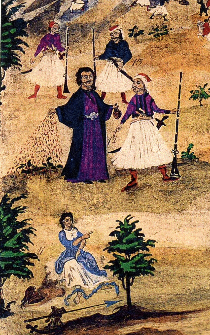 Χαρακτηριστικά είναι τα λόγια του στρατηγού Μακρυγιάννη στον πίνακα «Πτώσις της Κωνσταντινουπόλεως», όπου ο Ρήγας σπέρνει τον σπόρο της Ελευθερίας: «Μετά πολλούς αιώνας Ρήγας ο Βελεστινλής σπύρει τον σπόρον της ελευθερίας εις τους Έλληνας και τους ενθαρρύνει οδηγών αυτούς τον τρόπον της απελευθερώσεως των. Οι Έλληνες ενθουσιασθέντες και ενθαρρυθέντες από τους λόγους του Ρήγα έλαβον τα όπλα υπέρ της ελευθερίας».