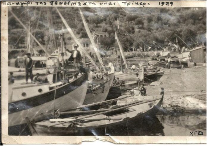 Θυμάμαι βέβαια και την ευτυχία της αποβίβασης, σαν πιάναμε το λιμανάκι. Ό,τι μας έλειπε βρισκόταν εκεί! χαλβάδες, σούβλες με αρνιά που ψήνονταν, φωτογράφοι με το τρίποδο επί ποδός, παγκυριώτες ψιλικατζήδες …..αχ και εκείνα τα παιχνίδια στους φωτισμένους με ασετυλίνη πάγκους, το τάκα τάκα, το γιογιό, ο μύλος και ο καραγκιόζης που έκανε τα ακροβατικά, τα μπιχλιμπίδια και τόσα άλλα που μας έπαιρναν το μυαλό… Λίγο πιο πέρα, οι γονείς μας, κατά παρέες, ετοίμαζαν τη στρωματσάδα τους κάτω από τις ασημόφυλλες ελιές για να περάσουμε όλοι μαζί τη νύχτα. Μετά τον Εσπερινό, επακολουθούσε τρικούβερτο γλέντι με τις λαϊκές ορχήστρες που στήνονταν στα δυο μαγαζάκια. Γλέντι που τελείωνε το πρωί, πριν την πρώτη καμπάνα που μας καλούσε και πάλι να ανηφορίσουμε στο Μοναστήρι για να ξαναπάρουμε την ευλογία της θαυματουργού Παναγίας, της Τρικεριώτισσας.