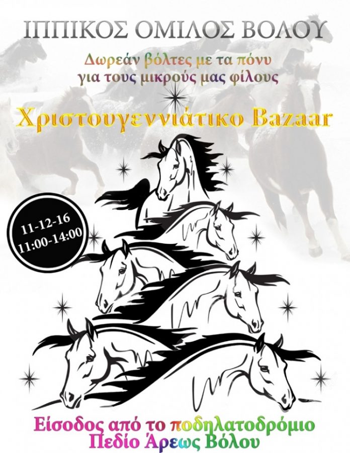 Χριστουγεννιάτικο BAZAAR διοργανώνεται από τον Ιππικό Όμιλο Βόλου. Η σχετική ανακοίνωση αναφέρει: “Ο Ιππικός Όμιλος Βόλου σας προσκαλεί στην Χριστουγεννιάτικη εκδήλωση που διοργανώνει στις εγκαταστάσεις του ομίλου στο Πεδίον του Άρεως στο Βόλο (είσοδος από ποδηλατόδρομο) την Κυριακή 11/12/2016 και ώρα 11:00-14:00. Η εκδήλωση περιλαμβάνει Χριστουγεννιάτικο BAZAAR με δημιουργίες από τους μικρούς και μεγάλους αθλητές, ενώ οι μικροί μας φίλοι θα έχουν την δυνατότητα να δοκιμάσουν μια δωρεάν βόλτα με τα pony”.