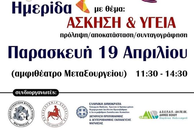 Επιμορφωτική Ημερίδα διοργανώνει η Ένωση Πτυχιούχων Φυσικής Αγωγής Μαγνησίας, σε συνεργασία με το Πανεπιστήμιο Θεσσαλίας, τις Διευθύνσεις Πρωτοβάθμιας και Δευτεροβάθμιας Εκπαίδευσης Μαγνησίας και τον ΔΟΕΠΑΠ-ΔΗΠΕΘΕ Δήμου Βόλου, την Παρασκευή 19 Απριλίου 2019 και ώρα 11:30, στο αμφιθέατρο Μεταξουργείου.Η είσοδος είναι δωρεάν για όλους και θα δοθούν βεβαιώσεις συμμετοχής.