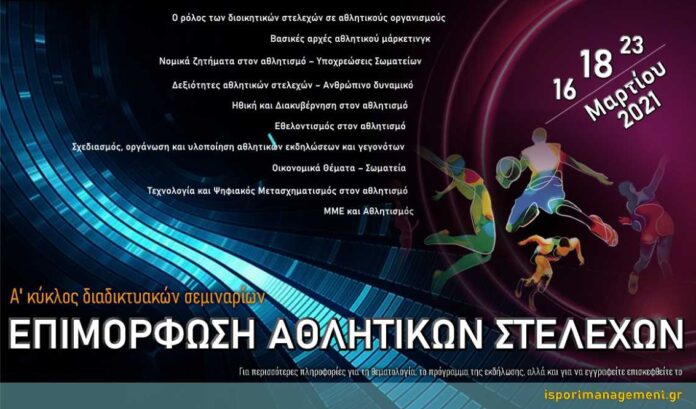 Ο Α’ κύκλος διαδικτυακών Σεμιναρίων Επιμόρφωσης Αθλητικών Στελεχών, στο πλαίσιο των δράσεων του Υφυπουργείου Αθλητισμού για άμεση δημιουργία Ινστιτούτου Επιμόρφωσης Αθλητικών Στελεχών, ανακοινώθηκε από τον Υφυπουργό Αθλητισμού, Λευτέρη Αυγενάκη.