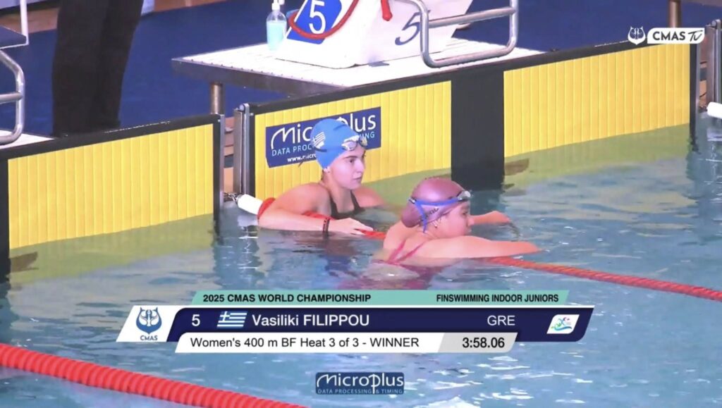 Στην 3η προκριματική σειρά των 400μ. διπλά πέδιλα στο Παγκόσμιο πρωτάθλημα τεχνικής κολύμβησης Νέων-Νεανίδων στη Χίο η αθλήτρια της Νίκης Βόλου, Βασιλική Φιλίππου, κατέκτησε σήμερα Σάββατο (21/6) την 1η θέση με χρόνο 3.58.06 και πέρασε στον κυριακάτικο τελικό με την τρίτη καλύτερη επίδοση, κάτι που γεννά ελπίδες και για ένα παγκόσμιο μετάλλιο.