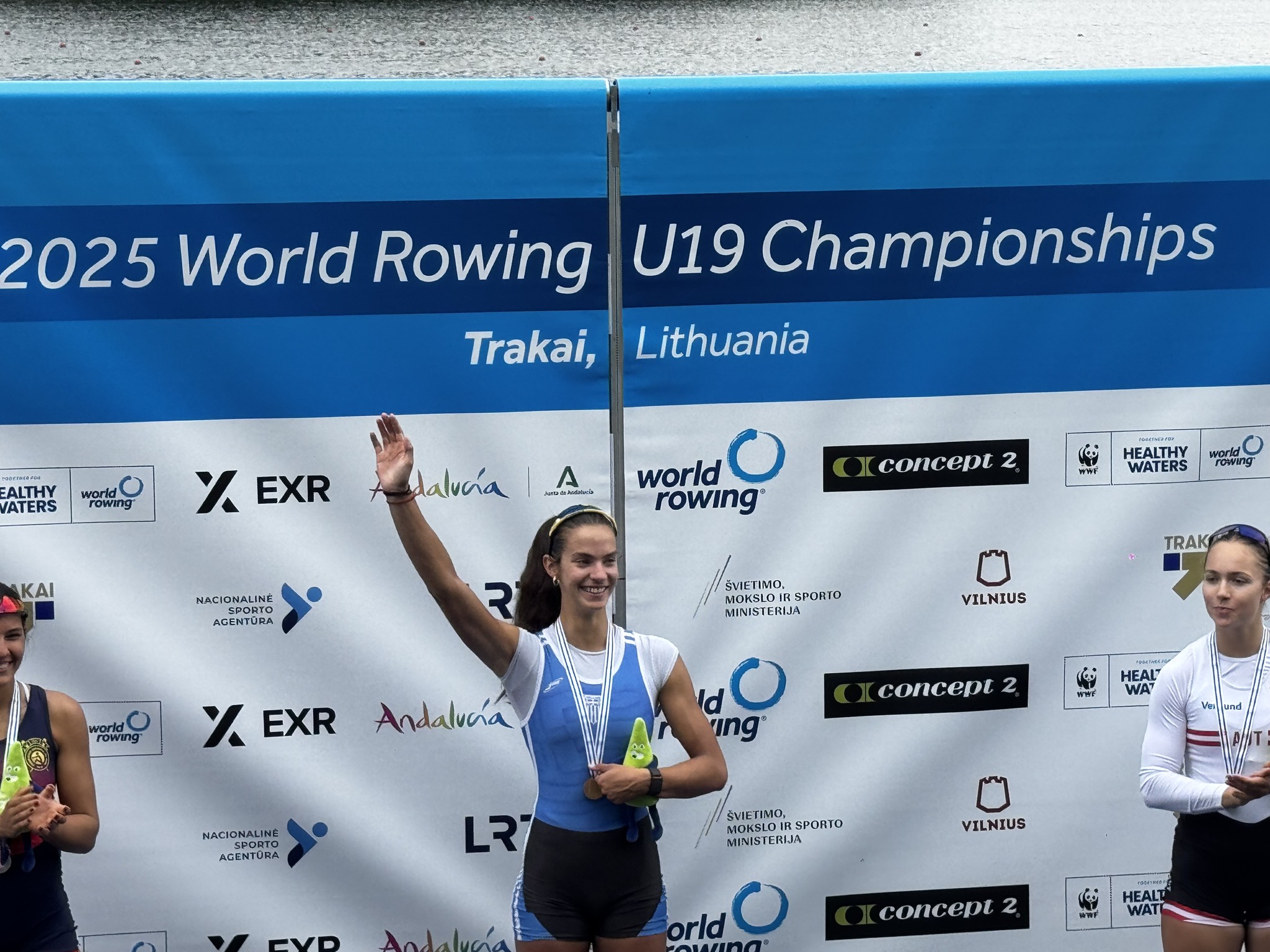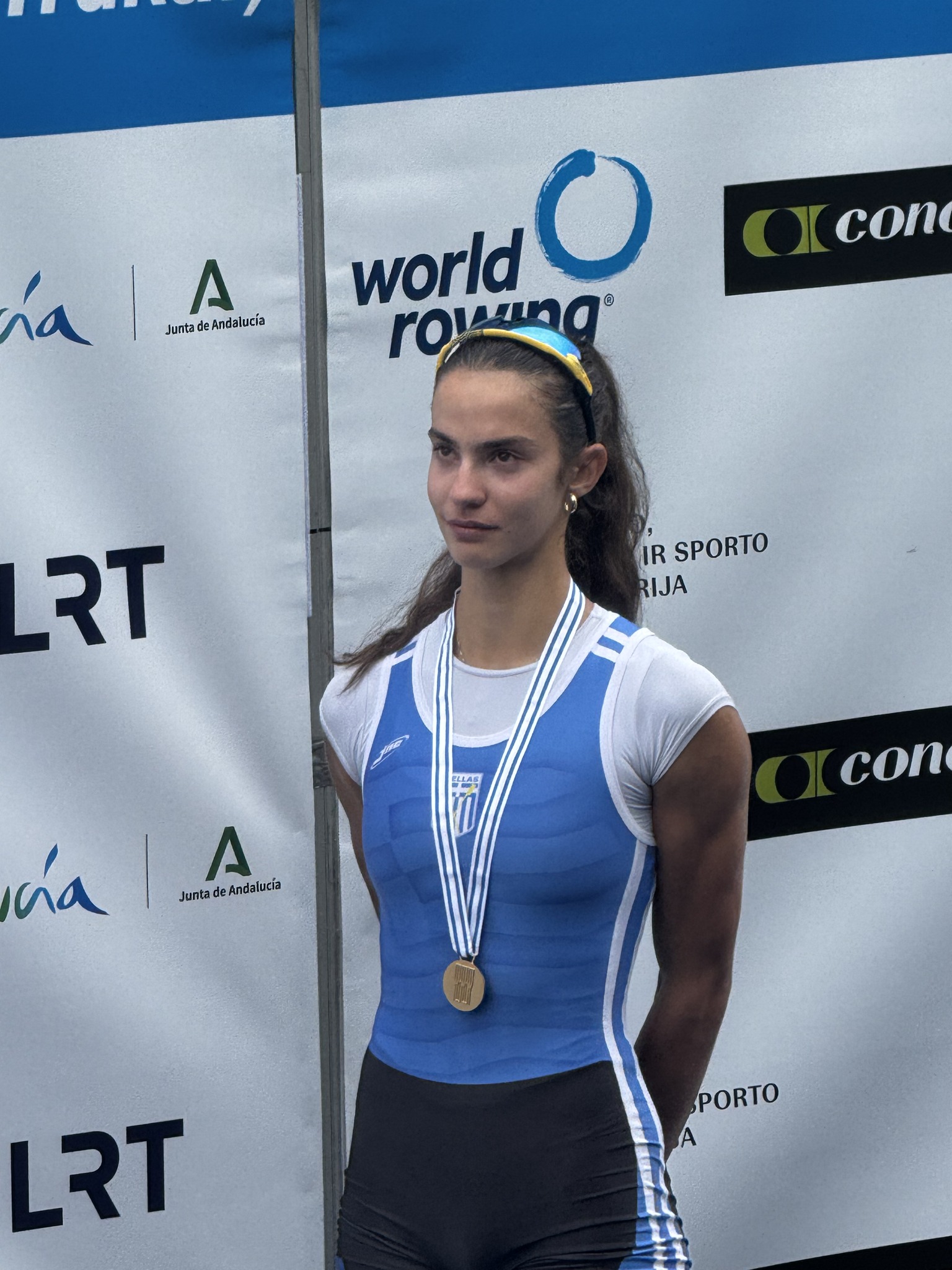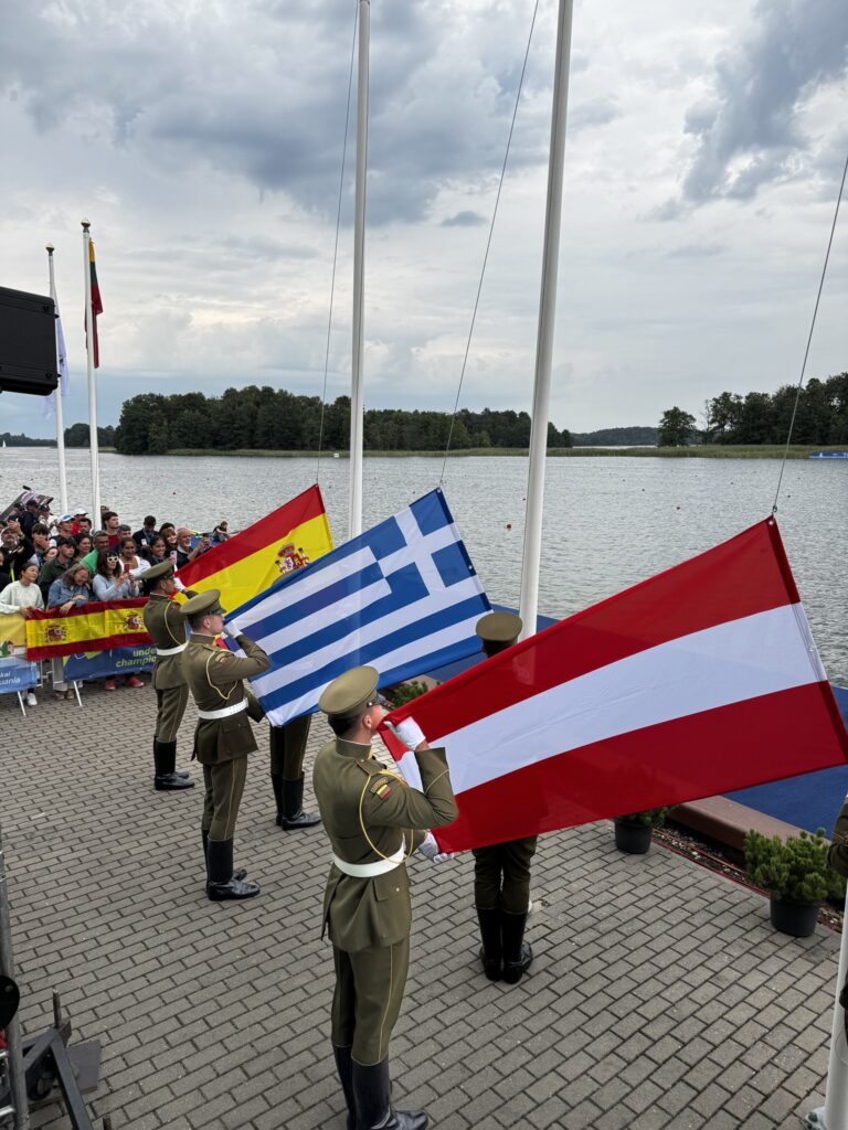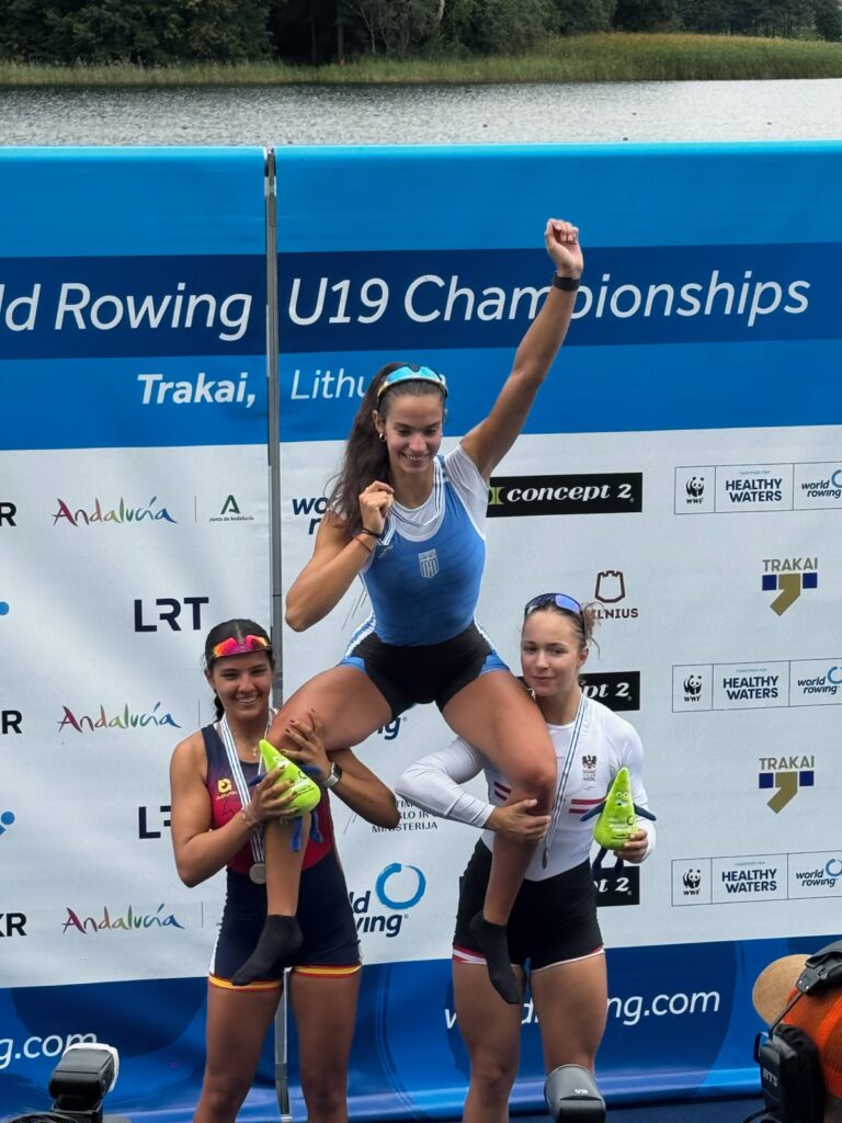 Εμφανώς συγκινημένη αλλά και υπερήφανη η Βάλια Λυκομήτρου άκουσε τον Εθνικό Ύμνο κατά την απονομή του χρυσού μεταλλίου στο Τρακάι της Λιθουανίας, όπου διεξάγεται το Παγκόσμιο Κωπηλασίας Εφήβων-Νεανίδων.