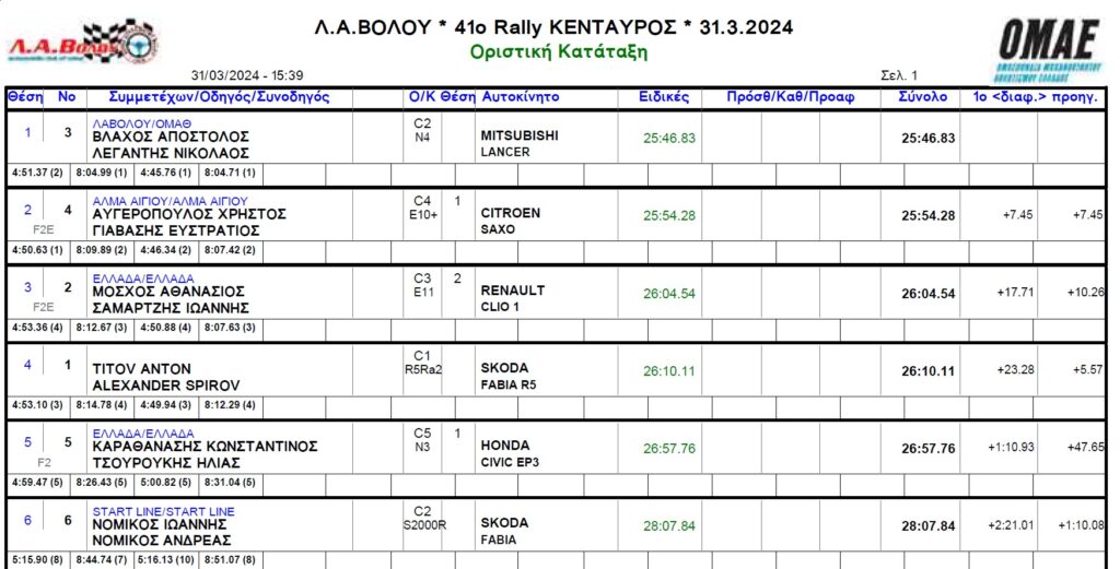 Θυμίζουμε ότι την περασμένη Κυριακή 31 Μαρτίου από την Αγριά (Hotel Valis) ξεκίνησε ο αγώνας και ακολούθησαν οι 4 ειδικές διαδρομές (2 επαναλαμβανόμενες) συνολικού μήκους 40,30 αγωνιστικών χιλιομέτρων, προσφέροντας οδηγική απόλαυση στα πληρώματα που συμμετείχαν στον αγώνα. Ο τερματισμός έγινε το μεσημέρι της ίδιας ημέρας στο χωριό των Αφετών.