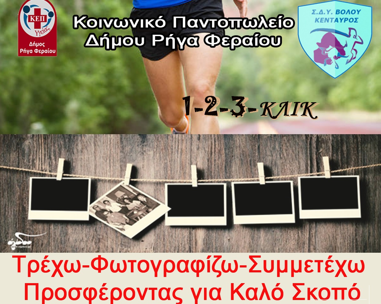 Το ΚΕΠ Υγείας του Δήμου Ρήγα Φεραίου με την υποστήριξη των Δρομέων του Κένταυρου – Βόλου διοργανώνουν μια αθλητική δραστηριότητα με φιλανθρωπικό, πολιτιστικό και κοινωνικό χαρακτήρα και σας προσκαλούν να φορέσετε τα αθλητικά σας παπούτσια, να καλύψετε τρέχοντας ή περπατώντας όποια απόσταση επιθυμείτε, να φωτογραφίσετε την πιο όμορφη εικόνα στη διαδρομή σας και να ενισχύσετε το Κοινωνικό Παντοπωλείο του Δήμου Ρήγα Φεραίου.