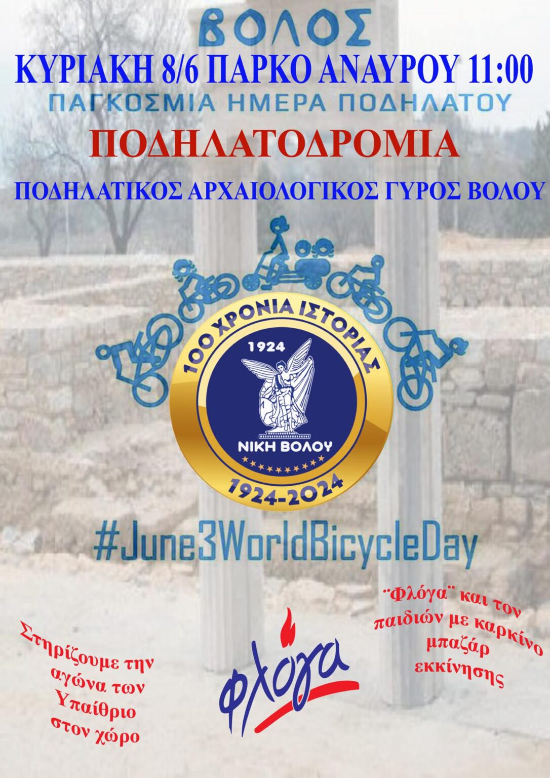 Αναλυτικά: «Το τμήμα ποδηλασίας της Νίκης Βόλου, σε συνεργασία με τη «Φλόγα» Μαγνησίας, στο πλαίσιο του εορτασμού της Παγκόσμιας Ημέρας Ποδηλάτου που έχει θεσπιστεί από τον ΟΗΕ στις 3 Ιουνίου, διοργανώνει την Κυριακή 8 Ιουνίου και ώρα 11:00, στο Πάρκο Αναύρου, μια ξεχωριστή ποδηλατοδρομία με έντονο πολιτιστικό χαρακτήρα.