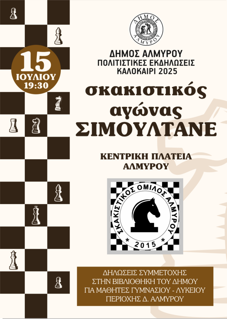 Ανοιχτή Σκακιστική Εκδήλωση “ΕΠΙΔΕΙΞΗ ΣΚΑΚΙ ΣΙΜΟΥΛΤΑΝΕ” διοργανώνει ο Δήμος Αλμυρού σε συνεργασία με τον Σκακιστικό Όμιλο Αλμυρού την Τρίτη 15 Ιουλίου 2025 και ώρα 19:30 στην Κεντρική Πλατεία Αλμυρού.