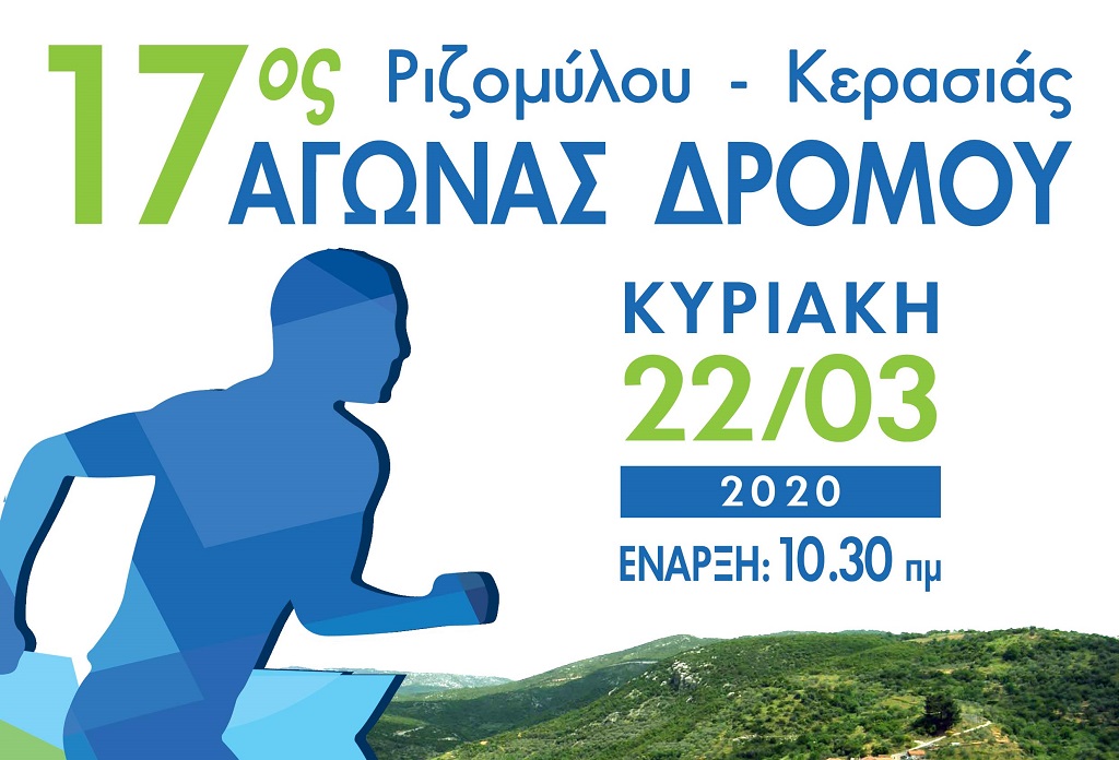 Ο Δήμος Ρήγα Φεραίου,η Περιφέρεια Θεσσαλίας το ΚΕΠ Υγείας Ρήγα Φεραίου και ο Σύλλογος Δρομέων Υγείας Βόλου-Κένταυρος με την υποστήριξη της Λέσχης Ειδικών Δυνάμεων Νόμου Μαγνησίας, της Ένωσης Πτυχιούχων Φ. Αγωγής Μαγνησίας και των πολιτιστικών Συλλόγων Ριζομύλου-Διάπλαση, Κερασιάς, Καναλίων, του ΚΙΠΟΚΕ και των τοπικών κοινοτήτων Ριζομύλου, Κερασιάς,διοργανώνουν στις 22 Μαρτίου 2020 τον 17ο αγώνα δρόμου Ριζομύλου-Κερασιάς απόστασης 21χλμ. ενώνοντας τα δύο Μαρτυρικά Χωριά, καθώς και τον παράλληλο αγώνα 5,2 χλμ Κανάλια-Κερασιά και 500μ για παιδιά στην Κερασιά.