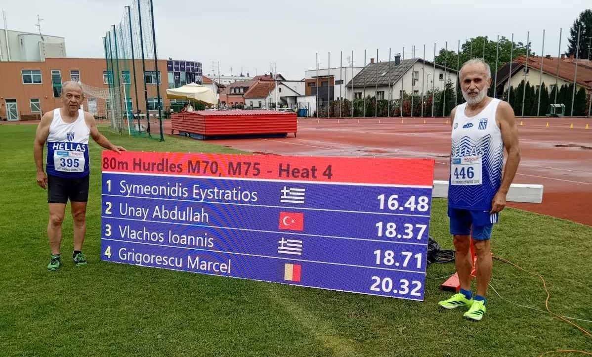 Ο 71χρονος δρομέας κατέκτησε τη νίκη στην κατηγορία 70+ ετών στα 80 μέτρα με εμπόδια, με επίδοση 16″48. Η Εθνική είχε και άλλη επιτυχία στο αγώνισμα, καθώς στο βάθρο ανέβηκε επίσης ο Γιάννης Βλάχος, που ήταν 3ος με 18″71.