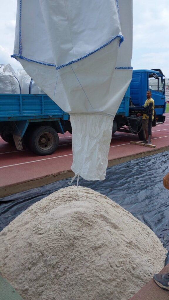 Η χαλαζιακή άμμος τοποθετήθηκε πάνω από ειδικό γεώπανο, το οποίο λειτουργεί αποστραγγιστικά και εξασφαλίζει ότι δεν θα γίνει ανάμειξη με το παλιό υπόστρωμα.