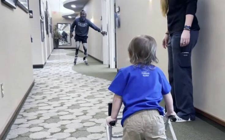 Ο Αμερικανός παραολυμπιονίκης Blake Leeper βρήκε τον τρόπο να κάνει χαρούμενο έναν 2χρονο, που είχε βάλει το προσθετικό του πόδι και άρχιζε να μαθαίνει πώς να περπατά.