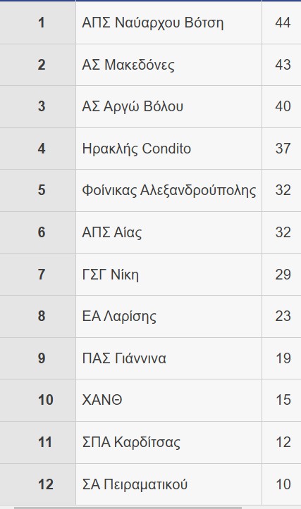 Τα υπόλοιπα αποτελέσματα της 19ης αγωνιστικής: Νίκη Αλεξανδρούπολης, ΣΠΑ Καρδίτσας 3-0, Αίας Ευόσμου-ΠΑΣ Γιάννινα 3-1, ΕΑΛ, Φοίνικας Αλεξανδρούπολης 3-0.