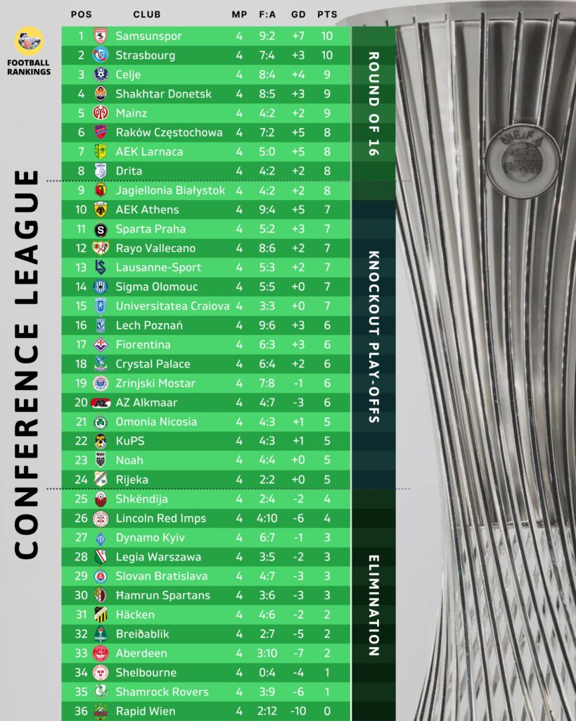 Τα αποτελέσματα της 4ης αγωνιστικής του Κόνφερενς Λιγκ είναι τα κάτωθι:
