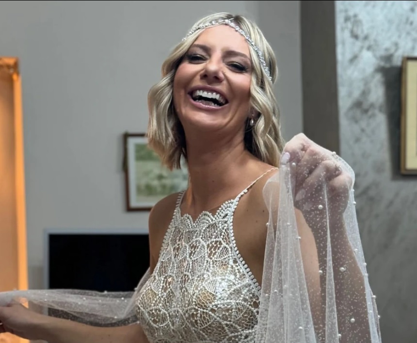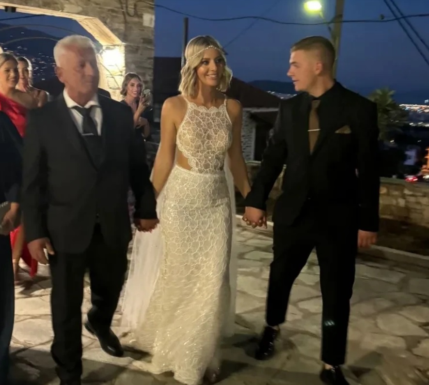 Η Eλένη Χαμπέρη ήταν ιδιαίτερα χαρούμενη και έλαμπε μέσα στο πριγκιπικό νυφικό της, ενώ ο γαμπρός εντυπωσίασε με το σμαραγδί κοστούμι του.