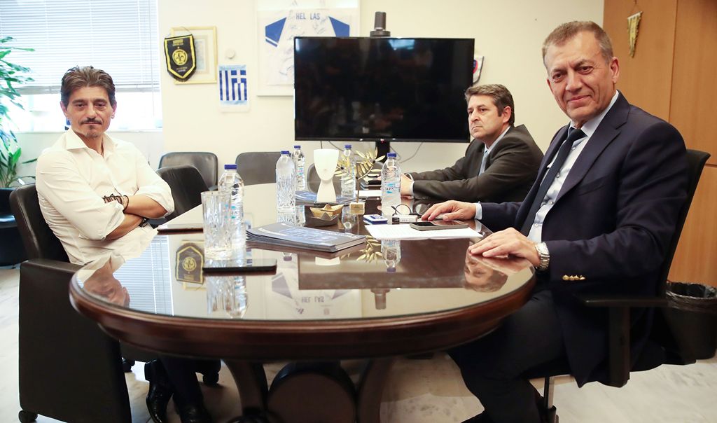 Ο Δημήτρης Γιαννακόπουλος βρίσκεται στο γραφείο του Αναπληρωτή Υπουργού Αθλητισμού, Γιάννη Βρούτση, με σκοπό να συζητήσουν για τη συνέχεια του ελληνικού πρωταθλήματος.