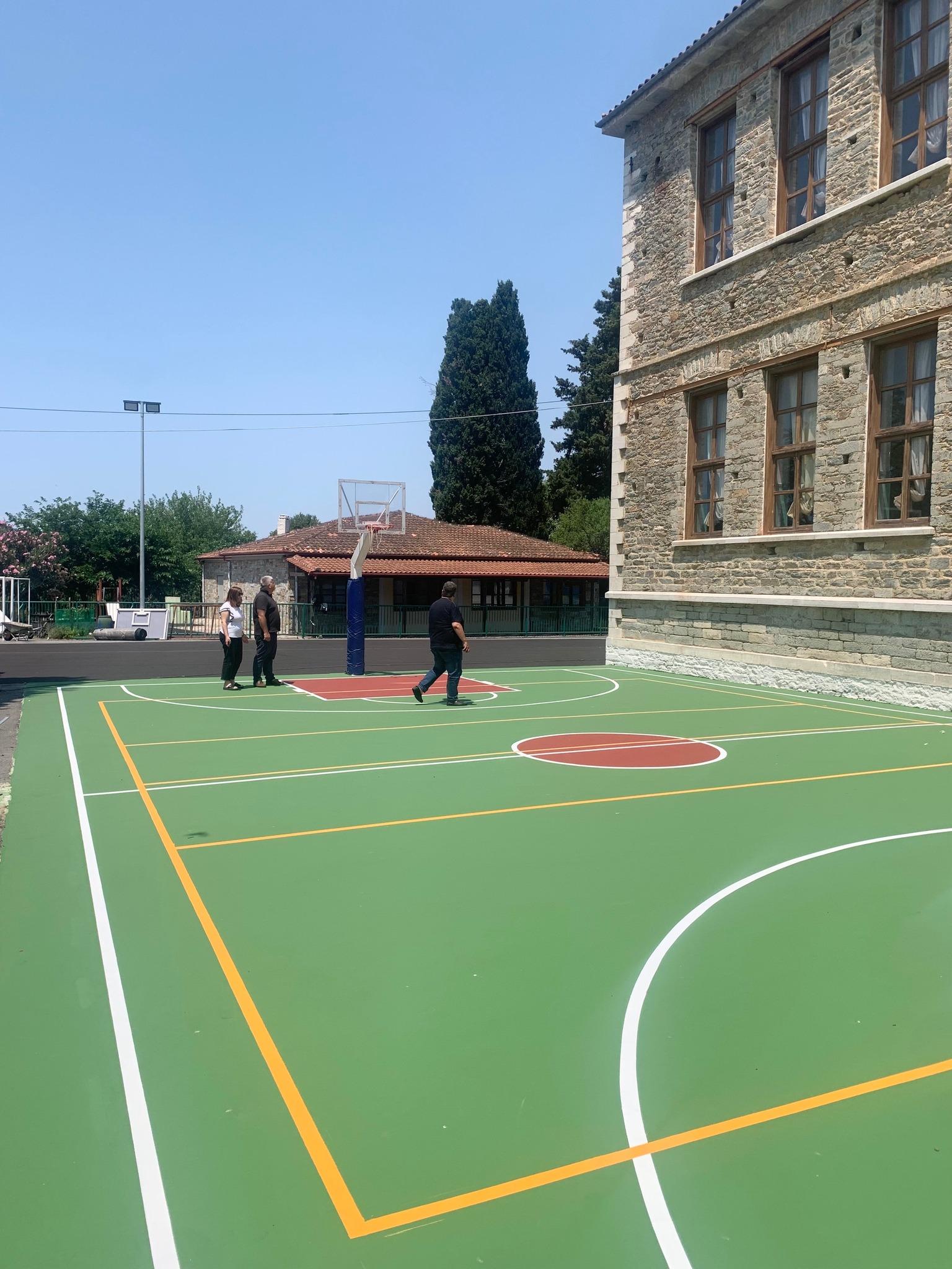 Στο γήπεδο τοποθετήθηκε προστατευτικός τάπητας για καλύτερη ασφάλεια των μαθητών εν ώρα γυμναστικής και αθλημάτων.
