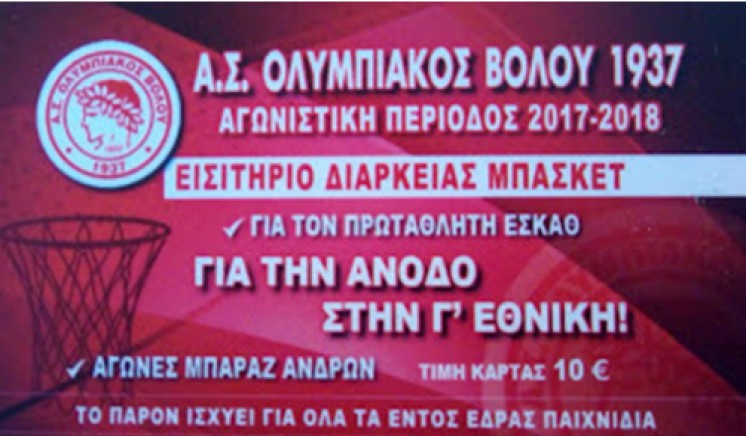 «Εισιτήρια διάρκειας κυκλοφόρησαν από τη Διοικούσα Επιτροπή μπάσκετ των τμημάτων μπάσκετ του Ολυμπιακού Βόλου ενόψει των PLAY OFFS της Α1 ΕΣΚΑΘ που θα οδηγήσουν στην άνοδο στη Γ’ Εθνική κατηγορία.