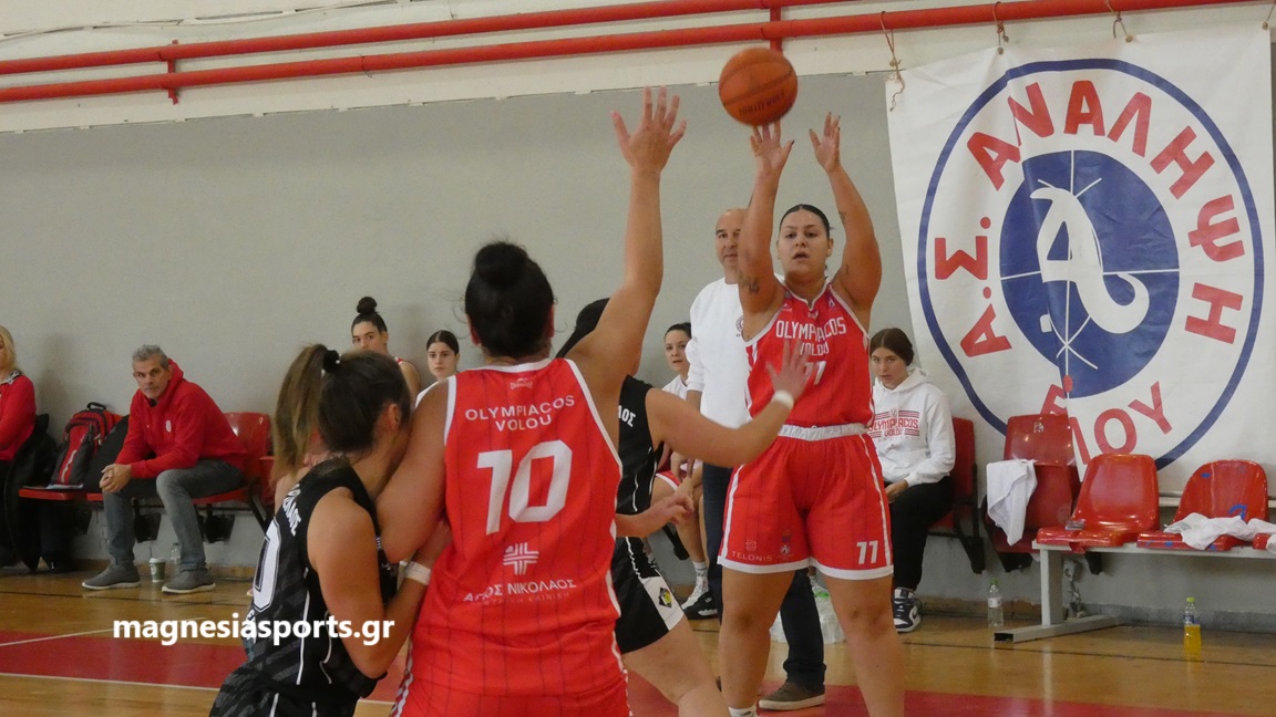 Το πρώτο δεκάλεπτο ήταν πολύ καλό για τις «ερυθρόλευκες» που βρήκαν και επιθετικές και αμυντικές λύσεις, με την Μανουτσαριάν να κάνει καλή δουλειά στο σκοράρισμα. Ωστόσο οι φιλοξενούμενες βρήκαν τα πατήματά τους στη συνέχεια και πέρασαν μπροστά στο σκορ, όντας στο +7 στο ημίχρονο. Η εικόνα αυτή δεν άλλαξε στη συνέχεια, με τον Ολυμπιακό Βόλου να γνωρίζει τελικά την ήττα με 15 πόντους διαφορά.