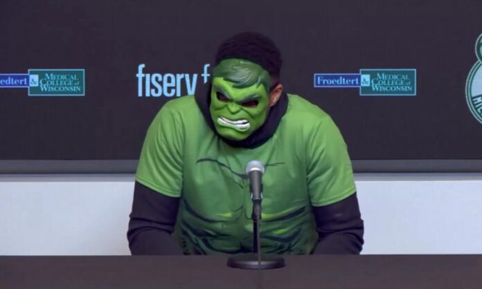 Ο Γιάννης Αντετοκούνμπο πήγε στο γήπεδο ως Hulk λόγω Halloween και μετά τη νίκη των Μπακς επί των Χιτ (122-114) με τη δική του πολύ καλή εμφάνιση, πήγε με την ίδια αμφίεση και στη συνέντευξη Τύπου.