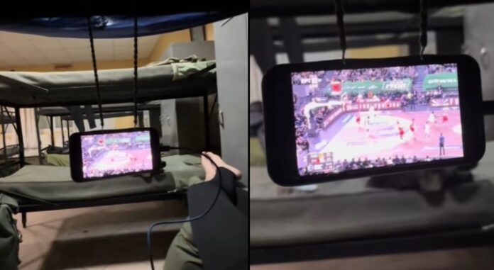 Σε ένα βίντεο που αναρτήθηκε στο TikTok φαίνονται δύο στρατιώτες να έχουν κρεμάσει με… λαστιχάκια ένα κινητό σε ένα από τα κρεβάτια του θαλάμου και να παρακολουθούν με άνεση τον κρίσιμο αγώνα. «Πατέντα για το ματς» έγραψαν στη λεζάντα.