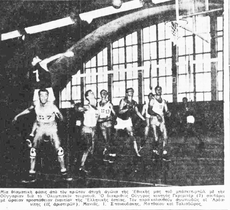 Προπονητής της ομάδας ο Νίκος Καραβιάς, και οι παίκτες για την εποχή τους και για τα ελληνικά δεδομένα, αφού το μπάσκετ τότε άρχισε να… εμφανίζεται στη χώρα, καλοί και που εξελίχθηκαν στη συνέχεια. Ανάμεσά τους η ιστορική μορφή του Φαίδωνα Ματθαίου που ξεχώριζε και του Ανέστη Πεταλίδη (αν και δεν τον εντοπίζουμε στη σύνθεση της εθνικής σε κανέναν αγώνα), ενώ τα αδέρφια Σπανουδάκη (Γιάννης και Αλέκος) ήταν και καινοτόμοι, σύμφωνα με τον δημοσιογράφο Βασίλη Σκουντή. «O επονομαζόμενος «Ατομιστής» Aλέκος Σπανουδάκης ήταν ο πρώτος παίκτης στην Ευρώπη, ο οποίος επιχείρησε το σουτ με άλμα (jump shot) και ο ανιδιοτελής Γιάννης εκείνος που λανσάρισε το screen στην άμυνα, ενώ ο συμπαίκτης τους στην Εθνική ομάδα, Τάκης Ταλιαδώρος (της ΧΑΝΘ) καθιέρωσε τη reverse ντρίμπλα!» αναφέρει σε κείμενό του το 2018!