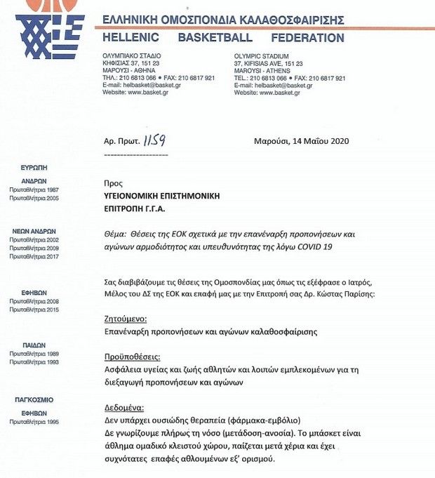 Η Ελληνική Ομοσπονδία Καλαθοσφαίρισης έστειλε έγγραφο προς την Υγειονομική Επιστημονική Επιτροπή της Γενικής Γραμματείας Αθλητισμού, σχετικά με το θέμα την επανεκκίνηση των ομαδικών προπονήσεων και των αγώνων που είναι στην αρμοδιότητα και την υπευθυνότητά της.