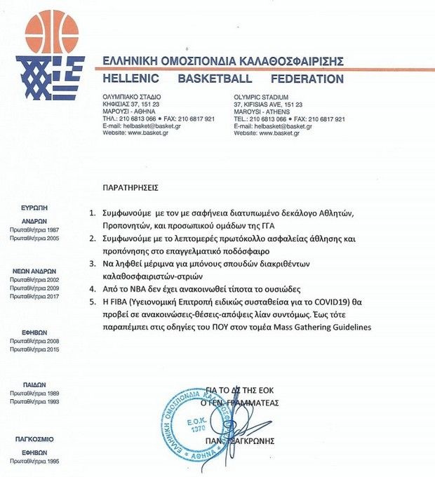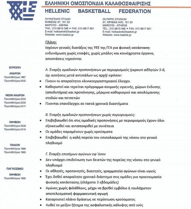 - Συμφωνούμε με τον με σαφήνεια διατυπωμένο δεκάλοτο Αθλητών, Προπονητών και προσωπικού ομάδων της ΓΓΑ. 2. Συμφωνούμε με το λεπτομερές πρωτόκολλο ασφαλείας άθλησης και προπόνησης στο επαγγελματικό ποδόσφαιρο.3. Να ληφθεί μέριμνα για μπόνους σπουδών διακριθέντων καθαθοσφαιριστών-στριών. 4. Από το ΝΒΑ δεν έχει ανακοινωθεί τίποτα το ουσιώδες. 5. Η FIBA (Υγειονομική Επιτροπή ειδικώς συσταθείσα για τον COVID-19) θα προβεί σε ανακοινώσεις-θέσεις-απόψεις λίαν συντόμως. Εως τότε παραπέμπει στις οδηγίες του ΠΟΥ στον τομέα Mass Gathering Guidelines».