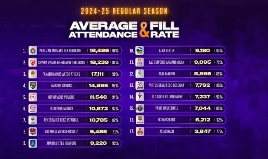 Στην κορυφή της λίστας βρέθηκε η Παρτίζαν με 18,484 φιλάθλους κατά μέσο όρο και πληρότητα γηπέδου στο 98%, με τον Ερυθρό Αστέρα να ακολουθεί με 18,239 θεατές και 94% αντίστοιχα.