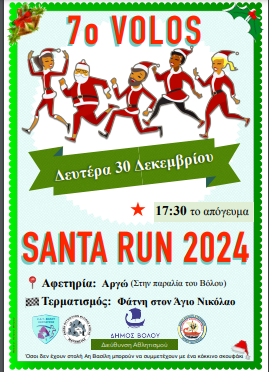 Στo πλαίσιo των εορταστικών εκδηλώσεων του Δήμου Βόλου, η Διεύθυνση Αθλητισμού του Δήμου Βόλου, με την υποστήριξη του Κένταυρου Βόλου, της Ένωσης Πτυχιούχων Φυσικής Αγωγής Μαγνησίας και της Λέσχης Ειδικών Δυνάμεων, διοργανώνει φιλανθρωπική δρομική εκδήλωση «7ο Volos Santa Run» τη Δευτέρα 30 Δεκεμβρίου στις 17:30.