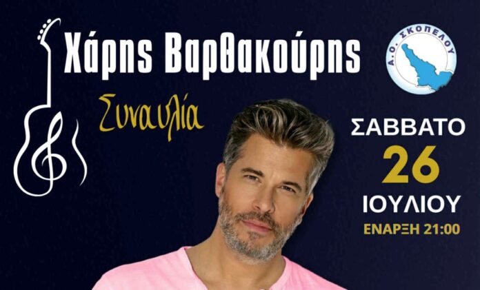 Στο δημοτικό αμφιθέατρο Σκοπέλου στις 26 Ιουλίου ο Α.Ο. Σκοπέλου διοργανώνει συναυλία του Χάρη Βαρθακούρη με σκοπό και την ενίσχυση του συλλόγου.
