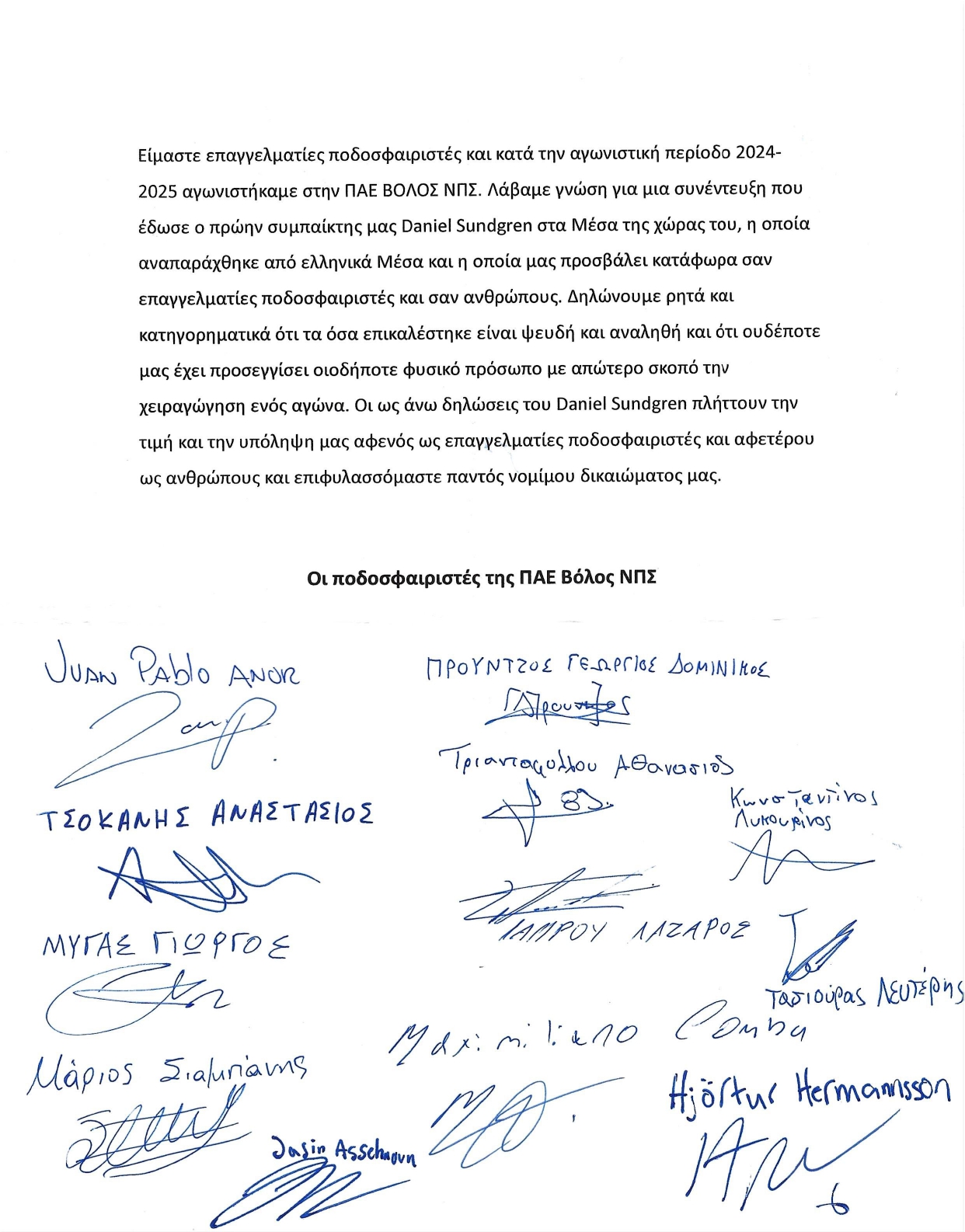 Αναλυτικά οι ποδοσφαιριστές του ΝΠΣ Βόλος αναφέρουν: «Είμαστε επαγγελματίες ποδοσφαιριστές και κατά την αγωνιστική περίοδο 2024-2025 αγωνιστήκαμε στην ΠΑΕ ΒΟΛΟΣ ΝΠΣ. Λάβαμε γνώση για μια συνέντευξη που έδωσε ο πρώην συμπαίκτης μας Daniel Sundgren στα Μέσα της χώρας του, η οποία αναπαράχθηκε από ελληνικά Μέσα και η οποία μας προσβάλλει κατάφωρα ως επαγγελματίες ποδοσφαιριστές και ως ανθρώπους. Δηλώνουμε ρητά και κατηγορηματικά ότι τα όσα επικαλέστηκε είναι ψευδή και αναληθή και ότι ουδέποτε μας έχει προσεγγίσει οιοδήποτε φυσικό πρόσωπο με απώτερο σκοπό τη χειραγώγηση ενός αγώνα. Οι ως άνω δηλώσεις του Daniel Sundgren πλήττουν την τιμή και την υπόληψή μας αφενός ως επαγγελματίες ποδοσφαιριστές και αφετέρου ως ανθρώπους και επιφυλασσόμαστε παντός νομίμου δικαιώματός μας.