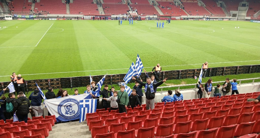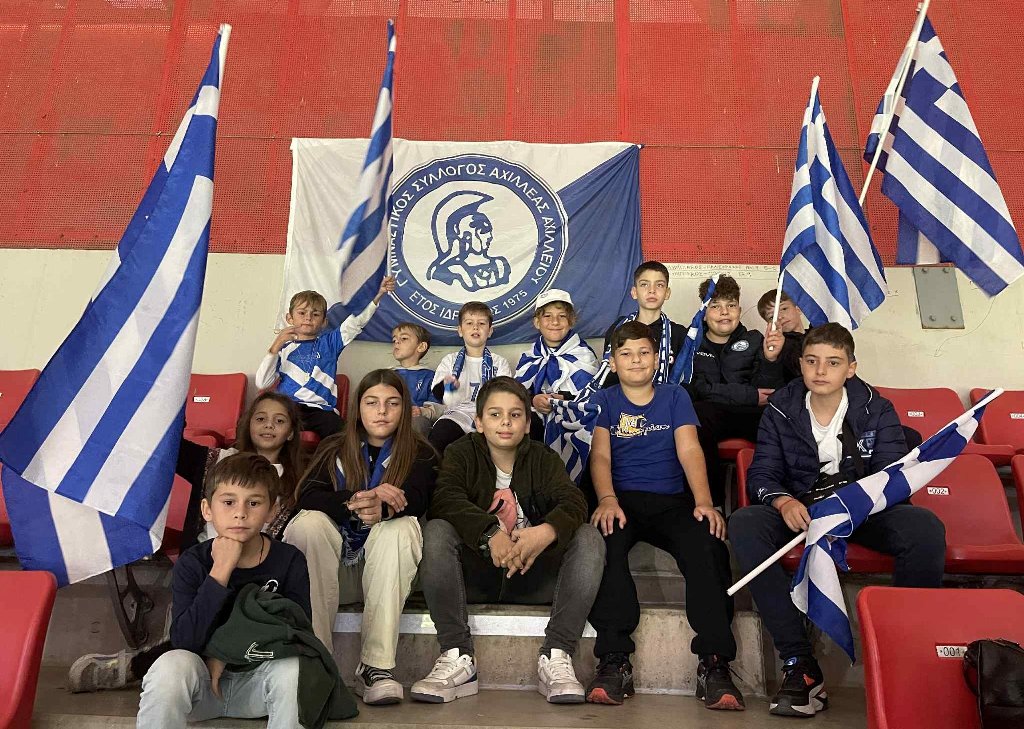 Έτσι, το Σάββατο 15 Νοεμβρίου, οι μικροί αθλητές του Αχιλλέα μαζί με τους γονείς τους και μέλη του συλλόγου βρέθηκαν στο Καραϊσκάκη και χειροκρότησαν τη γαλανόλευκη, που κέρδισε τη Σκωτία.