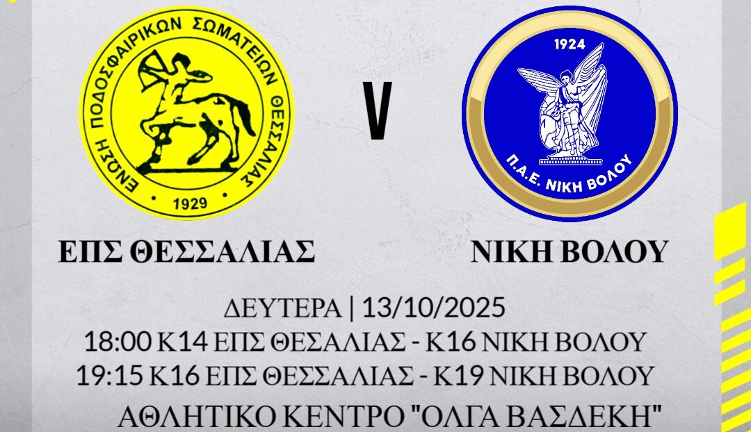 Κ14 ΕΠΣ Θεσσαλίας – Κ16 Νίκη Βόλου, ώρα προσέλευσης 17:45 , ώρα έναρξης 18:00