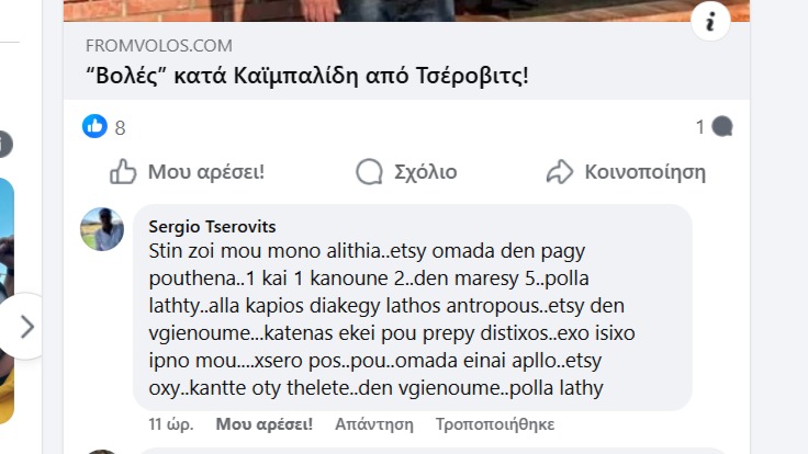 Ο Σέρτζιαν Τσέροβιτς εμμένει στις απόψεις του για τον Ολυμπιακό Βόλου, όπως φαίνεται και από το σχόλιο που έκανε στο facebook, όπου τονίζει ότι έχουν γίνει λάθος επιλογές που ενδεχομένως θα κοστίσουν στην ομάδα την άνοδο. Το σχόλιο είναι το εξής: