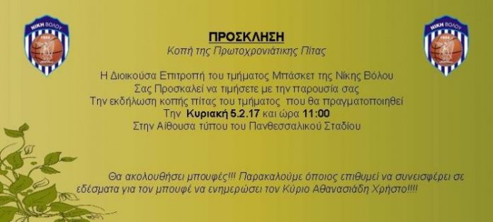 «Με χαρά ανακοινώνουμε ότι την Κυριακή 5/2/2017 και ώρα 11.00 το τμήμα Καλαθοσφαίρισης των Ακαδημιών θα πραγματοποιήσει εκδήλωση, με αφορμή την κοπή της πρωτοχρονιάτικης πίτας, στην αίθουσα Τύπου του Πανθεσσαλικού Σταδίου. Παρακαλούμε τους αθλητές να παρευρεθούν στην εκδήλωση με τις φόρμες προπόνησης της Νίκης Βόλου, ώστε να υπάρχει ομοιομορφία. Σας περιμένουμε όλους, αθλητές και γονείς, σε μια γιορτή σύσφιξης σχέσεων».