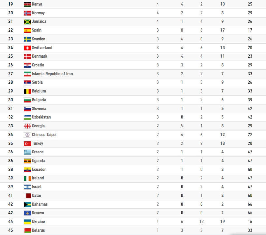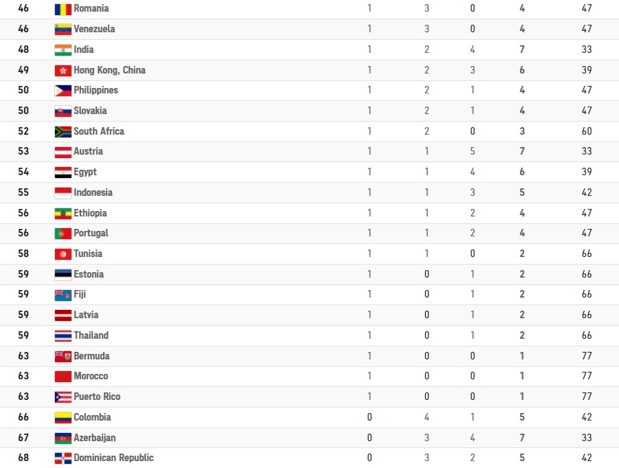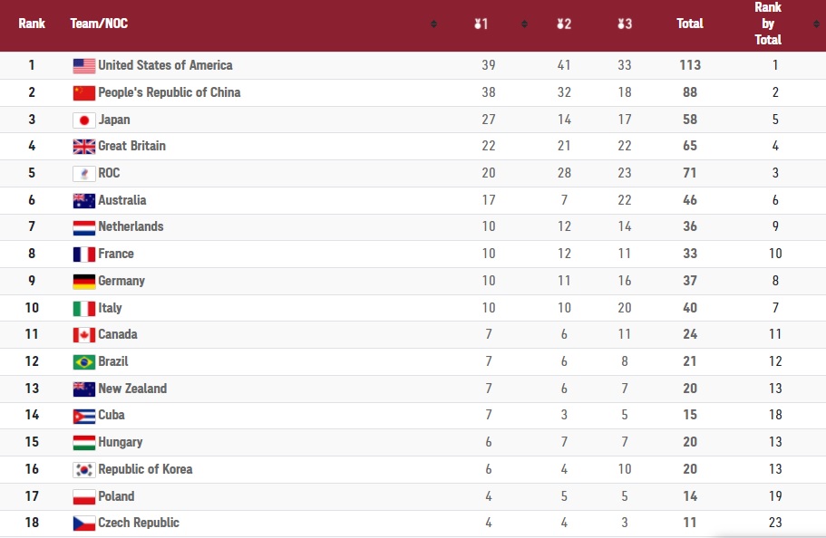 Στη δεύτερη θέση έμεινε η Κίνα με 88 συνολικά (38 χρυσά, 32 ασημένια και 18 χάλκινα) και στην τρίτη θέση η Ιαπωνία με 58 στο σύνολο (27 χρυσά, 14 ασημένια και 17 χάλκινα)